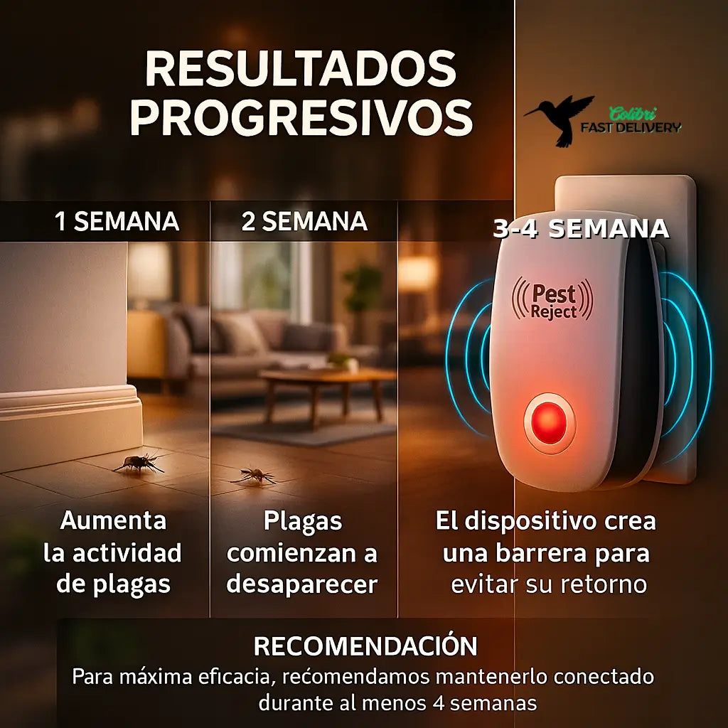 Protege tu hogar con tecnología ultrasónica segura para niños y mascotas. Conéctalo y listo: empieza a actuar en 24–72 h y verás resultados progresivos en 2–4 semanas.